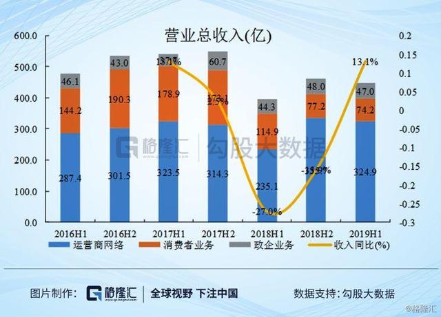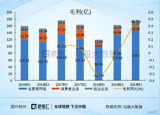 2019H1 运营商网络营业收入324.85 亿,同比增长38.19%,毛利率提升至44.73%,为近十年来最佳毛利表现;政企业务营业收入47 亿,同比增长6.02%,毛利率提升至36.95%,主要是由于国际数据中心产品、国际光传送产品、国际FDD 系统设备营业收入同比增长所致。消费者业务收入74.2 亿,同比下滑35.41%,毛利率提升至16.48%。
