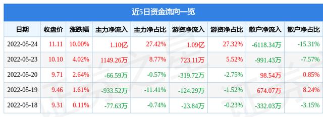 资金流向数据方面,5月24日主力资金净流入1.1亿元,游资资金净流入1.09亿元,散户资金净流出6118.34万元。