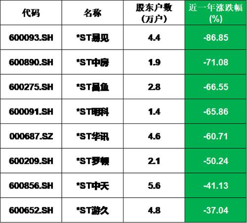 被“困”股东最多的是*ST中天。*ST中天的股价近一年内下跌41.13%,而股东户数上涨却是最多的。据东方Choice数据,*ST中天的股东户数从2021年9月底的3.3万户增加至2022年3月底的5.6万户,其间增加的2.2万户股民中,如果是买在高点的股民,亏损高达80%。