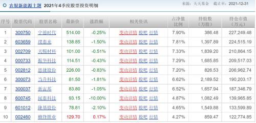 再看一下这只产品的持仓,从已经公布的2021年四季报数据来看,前十大重仓股中,除了闻泰科技外,宁德时代、璞泰来、天赐材料、振华科技、恩捷股份、当升科技、新宙邦、隆基股份、赣锋锂业9只股票和三季度持仓名单一致。