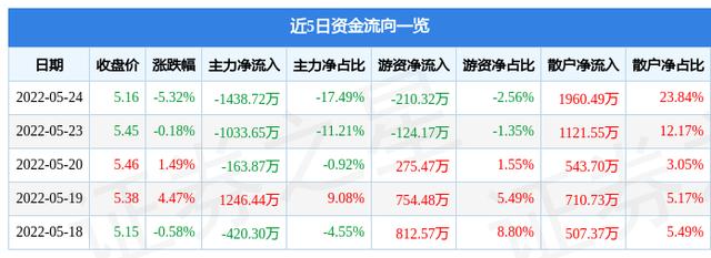 资金流向数据方面,5月24日主力资金净流出1438.72万元,游资资金净流出210.32万元,散户资金净流入1960.49万元。