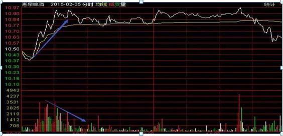 放量滞涨的分时图,重点表现在股价快速拉升,均价线没有跟上去,分时图产生乖离,而分时量又放量缩减,这时候要注意卖出,更要谨防分时追高的风险;