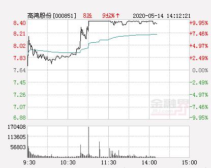 2020年5月14日金融界网站讯 今日11时02分,高鸿股份出现异动,附加大幅拉升9.95%,创历史新高(前复权价格)。截至发稿,该股8.4元/股,成交量107.069万手,换手率12.3%,振幅9.69%,量比2.48。