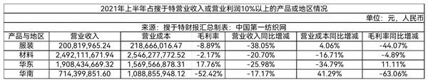 最新公布的财报显示,2021年前三季度,搜于特实现营业收入40.41亿元,同比下降30.08%,净亏损21.28亿元,同比止盈转亏,去年同期净利6023.35万元。