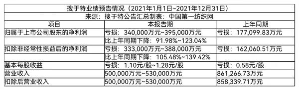 搜于特集团股份有限公司(以下简称“搜于特”)近日发布2021年度业绩预告,公司预计,报告期内实现营业收入50亿-53亿元,上年同期为85.83亿元,归属于上市公司股东的净利润亏损34亿元-39.5亿元,与上年同期的亏损17.70亿元相比下降91.98%-123.04%。