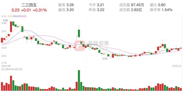 二三四五今日上涨0.31%,股价为3.23元,成交金额为2.82亿元,成交87万手,换手率为1.54%。
