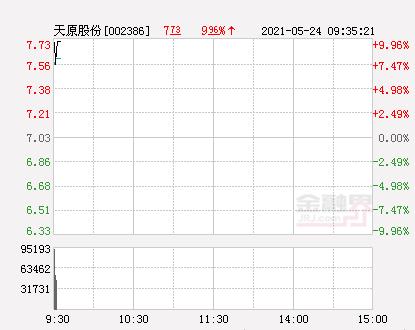 金融界网5月24日消息,今日天原股份开盘报7.35元,截止09:30分,该股涨9.96%报7.73元,封上涨停板。
