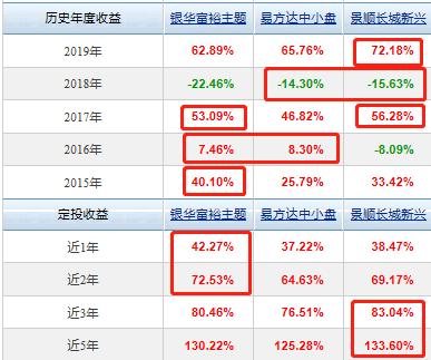 6、三项历史数据测评:历史阶段业绩、历史年度收益和历史定投回测中,三项都是银华富裕主题混合和景顺长城新兴成长相对突出,易方达中小盘混合表现稍微逊色。