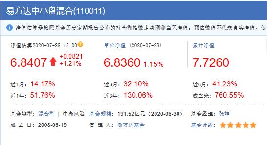 2、110011易方达中小盘混合,基金类型:混合型 | 中高风险,基金规模:191.52亿元(2020-06-30),基金经理:张坤,成 立 日:2008-06-19,基金评级:五星级