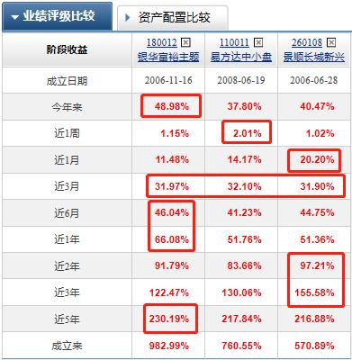近期各阶段业绩都有领先,银华富裕主题混合和景顺长城新兴成长相对突出,易方达中小盘混合表现有些吃力。