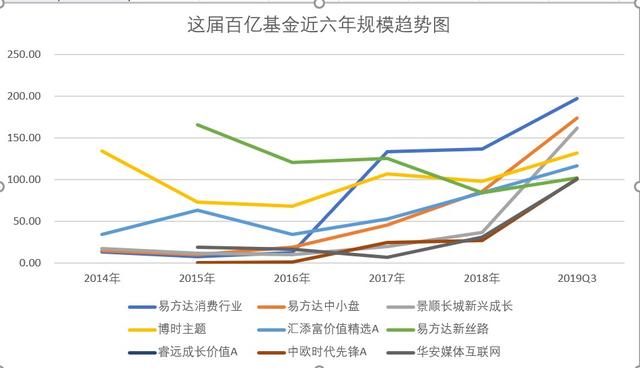 上表是近六年百亿基金名单,标红色为统计期间至少两次规模超过百亿的基金。可以看到,2014年主打蓝筹风;2015年则换成一水儿的新基金;2016年量化基金走红。2017年“漂亮50”当道,也是从那一年开始,新的趋势出现了:百亿基金队伍逐渐稳定,并在今年出现了大扩容。