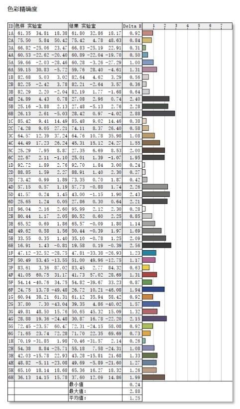 色彩精确度方面,显示器测试的48种颜色的平均△E值为1.25,当0