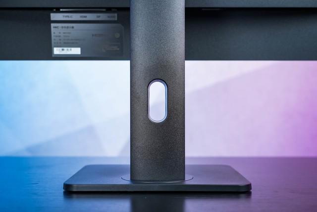 HKC T2751U的背面依旧采用纯黑配色,前后看上去整体性很强。结构方面,显示器在背面凸出了一部分的方形空间来容纳电源、主控板等内部元器件,整体看起来比较硬朗。显示器支架底部还有一个椭圆形孔,可以对电源线、信号线等线材起到一定束缚,从而为用户提供一个更为简洁的桌面空间。
