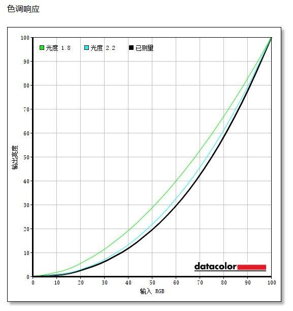色调响应方面,已测量的黑色曲线应该尽量和浅蓝色的“光度2.2”曲线保持一致,可以看到实测的黑色曲线和“光度2.2”曲线少有偏差,表现中等。