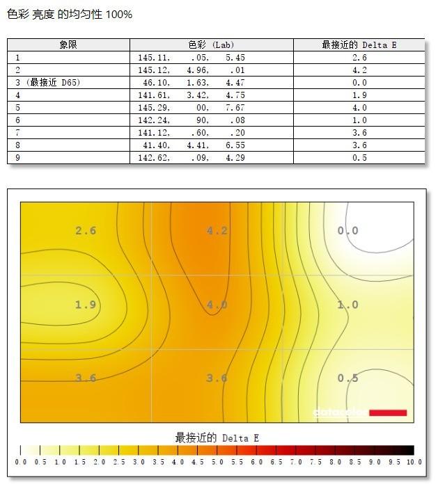在色彩均匀性的测试中,可以看出显示器右上位置的第3象限最接近D65的标准,显示器面板上方居中位置的第2象限与标准色温值有一定差距,差距数值在4.2,均匀度表现还算可以。