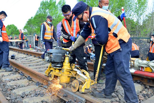 集中修施工期间,工务段职工进行钢轨打磨作业。张炯摄