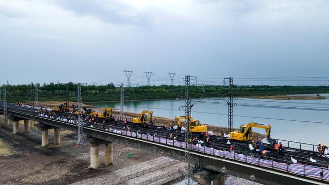 集中修施工期间,大秦线潮白河大桥,大型养路机械在清筛之后进行线路捣固作业。张炯摄