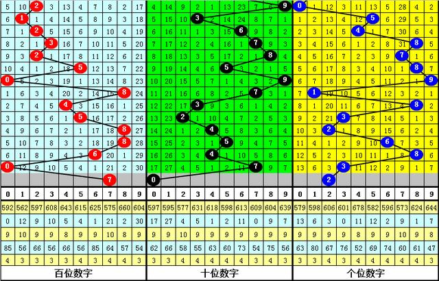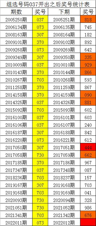 从上表可以看出,组选号码037开出之后,出现次数最多的三个号码分别为:682,本期防这三码中落号;出现次数最少的三个号码分别为:513,本期预计这三个号码不会同时出现,本期杀一码:5。