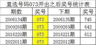 从上表统计可以看出,直选号码073开出之后,其下期奖号: