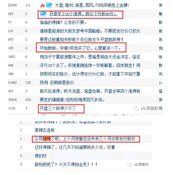 有股民直接了当:蛇吞象有戏,也有股民热血沸腾:银星能源,重大利好,复牌有望10—15个涨停板、开盘至少20个涨停,股价上升到40元。在一大片叫好声中,也不乏一些心受委屈者,“违规了吧”、“偷偷的停牌,公告都不要”、“应该建立停牌预告制度,把要停牌的理由和时间提前预告知,让参与者自己决定去还是留”,类似指责公司信息披露不合规者还不少。