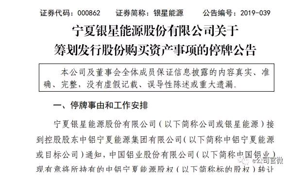 本文摘要:距离披露未来3个月内不筹划重大资产重组不足1月,银星能源(000862)突然给市场来了个急刹车:拟购买中国铝业(601600)股份有限公司(下称“中国铝业”)所持有的公司控股股东中铝宁夏能源集团有限公司(下称“中铝宁夏能源”)股权,公司股票… …