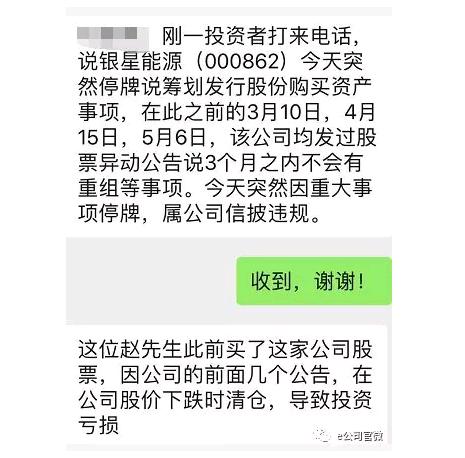 4日下午一位赵先生向e公司报料、投诉银星能源损害股民权益,称其此前买了该公司股票,因为看了公司之前不会筹划重大资产重组的公告,在公司股价下跌时清仓,导致投资亏损。