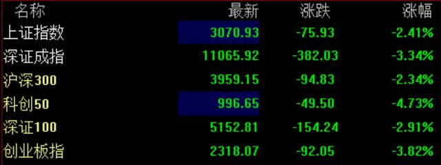 5月24日,三大指数午后集体下挫,沪指再度失守3100点,截至收盘,沪指跌2.41%,深成指跌3.34%,创业板指跌3.82%。