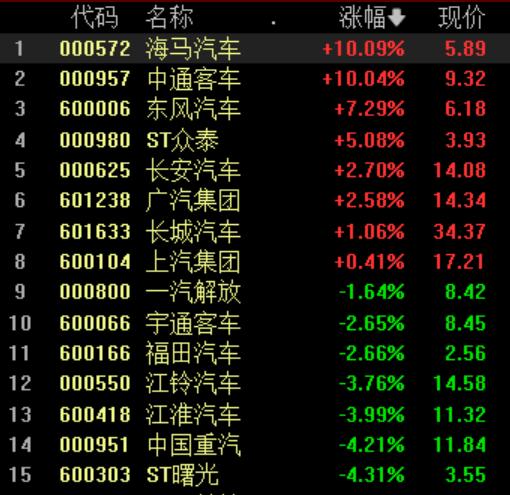 中通客车涨停,走出八连板,海马汽车午后拉升封涨停板,广汽集团、上汽集团、长安汽车等跟随板块走势高开低走。