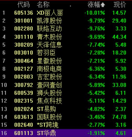 丽人丽妆跌停,凯淳股份、联络互动、青木股份跌超9%。