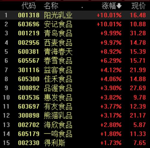 阳光乳业、安记食品、青岛食品、西麦食品涨停,青海春天、春雪食品、益客食品等跟涨。