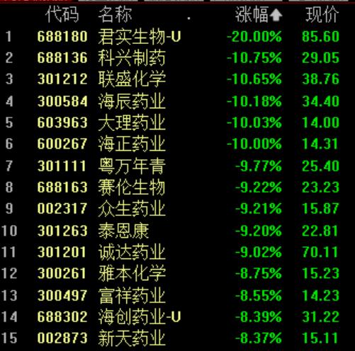 君实生物20cm跌停,科兴制药、联盛化学、海辰药业等跟跌。