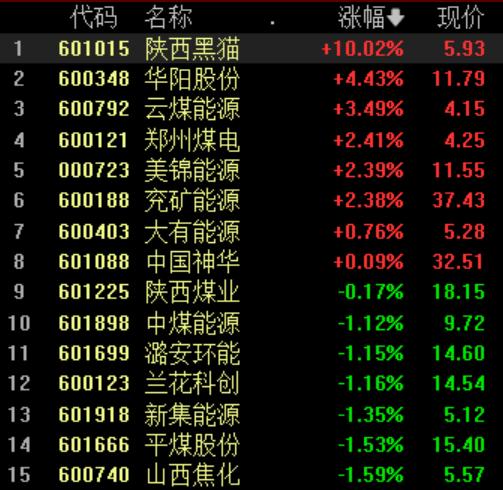 陕西黑猫涨停,华阳股份、兖矿能源、美锦能源、郑州煤电等跟涨。