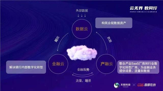 具体而言。“天阳云”分为金融云、产融云、数据云三大业务模块。“金融云”聚焦解决银行内部数字化转型,重点专注三方面业务:其一,银行创新业务,例如普惠金融、供应链金融、信用卡消费金融、财富管理等;其二,银行关键业务,例如营销、获客、风险预警、资产处置等;其三,高度依赖数字化业务,例如数字化信贷、数字营销、风险控制等。