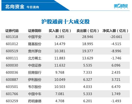 北向资金大举抛售中国平安。数据显示,北向资金今日净买入61.47亿元。前十大成交股中,净卖出额居前三的分别是中国平安、贵州茅台隆基股份,其中,中国平安遭净卖出20.66亿元。近七个交易日,中国平安遭北向资金净卖出32.53亿元。