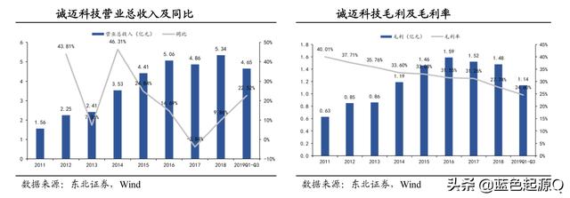 2018年,实现营收5.34亿元,同比上升9.86%,2019Q1-Q3实现营收4.65亿元,同比上升 22.52%。2016-2018年以及2019 H1,收入分别为4.45亿元、4.00亿元、4.64亿元、2.20亿元,同比增速分别为12.11%、-10.09%、15.98%、7.46%。