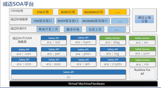 三是安全可靠。在满足车规级功能安全要求的大背景下,诚迈科技的SOA平台从应用服务层、AP AUTOSAR模块、Linux均有安全保障,并且通过了网络安全ISO21434。