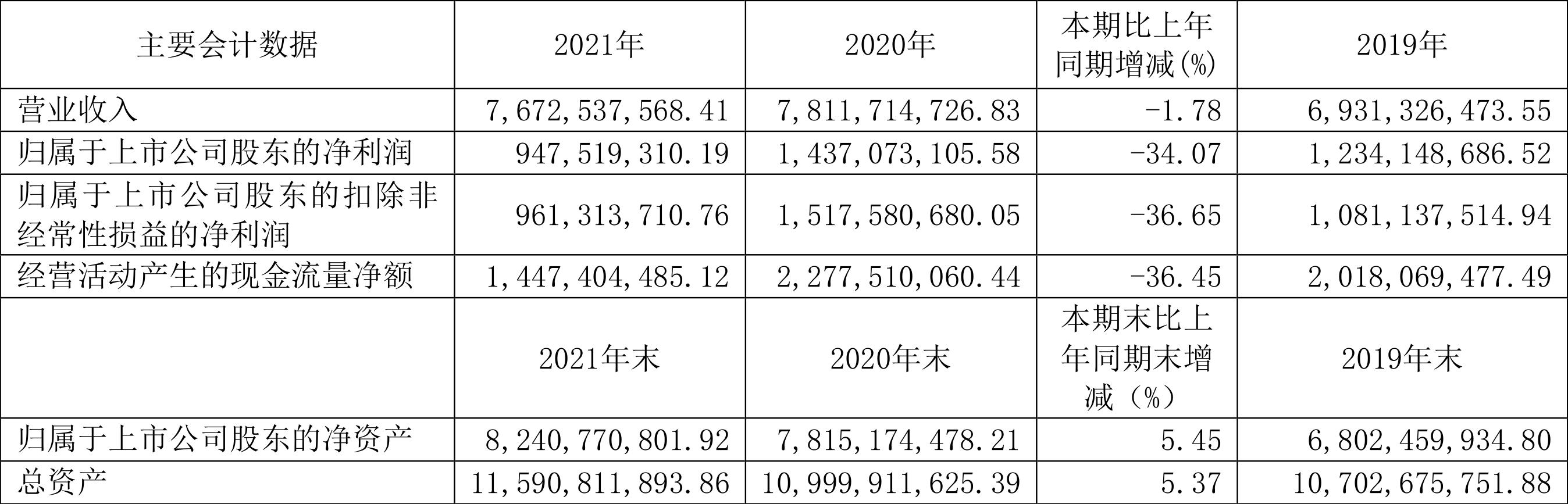 2021年全年,公司期间费用为7.52亿元,较上年减少950.19万元;但期间费用率为9.80%,较上年上升0.06个百分点。