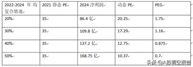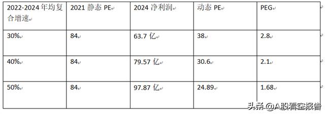阳光电源,这个大牛股也是要讲一下。目前市值2445亿,机构预计2021年净利润在29亿左右,假定未来三年,三种不同增速,我们来看下具体的估值情况。