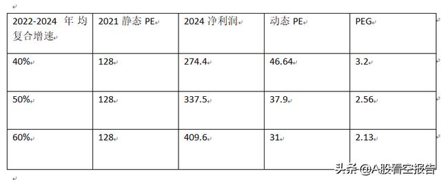 宁德时代,茅组合下台,宁组合火爆,我们来看下这个锂电池龙头!当前宁德时代市值1.28万亿,机构普遍预计今年净利润在100亿左右,我们假设未来三年,三种不同的增速情况,我们来看下具体的估值情况。
