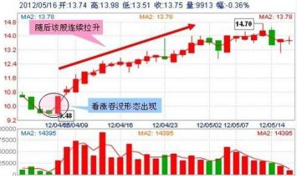 1. 看涨吞没形态”。 此种K线图形出现在一轮明显的下跌趋势中,如果吞没形态具有下面3种参考性要素和特征,那么它们构成重要反转信号的可能性将大大地增强。1、在看涨吞没形态中,第一天的实体非常小,而第二天的实体非常大。这种情况可能说明原有趋势的驱动力正在消退,而新趋势的潜在力量正在壮大;2、第二天的实体向前吞没的实体不止一个;3、看涨吞没形态出现在超长期的或非常急剧的市场运动之后。
