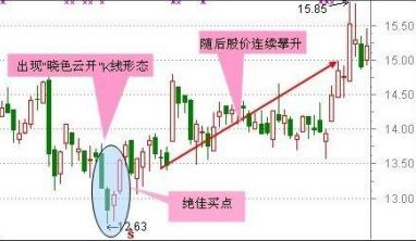 6 、“金鸡报晓”。 在连续下挫行情中,股价在低位收出大阴,空方大获全胜。次日却被多头打个措手不及,以高价开盘并最终红盘报收。此K线组由阴孕阳构成,犹如雨后虽然乌云满天,却已遮不住太阳的光芒,正所谓“晓色云开,春随人意,骤雨才过还晴”,故称“晓色云开”。