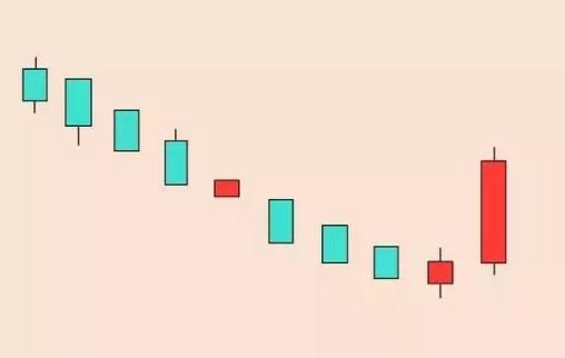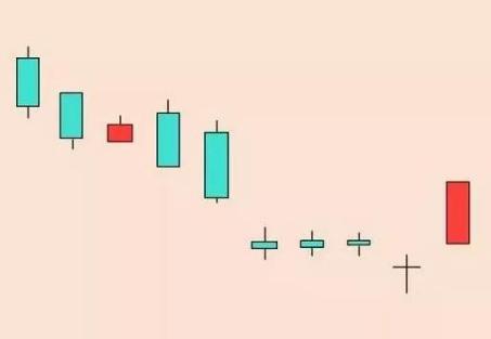 3、在下跌过程中,出现连续的小K线,几根小K线横向整理(比如三根:第四天在耕地的位置走出一个十字星,第五天大多数会收一个大阳线)。这种形态出现说明空方力量已经匮乏,经过短时间蓄力后虽然继续下压,但是很快被多方驳回,在最终的博弈中空方力量殆尽,多头开始发力拉升。