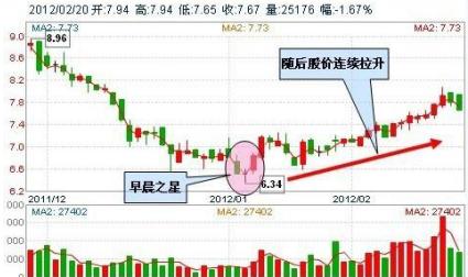 2 、“早晨之星”。 此种K线图形由三根K线构成。第一日股价承接原有跌势继续下行,并出现一根实体较长的阴线;第二日股价波幅缩小,收出实体较短带上下影线的阴线或阳线,称之为“星”,这是K线组合中的主体部分;第三日收出阳线,而且上涨至第一根K线实体之内,这是转市可靠性最高,力度最强的一种K线组合。