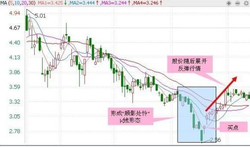 3 、“顾影处怜”。 股价加速下行,在低档位拉中长阴线,恐慌盘的涌出导致最后竟跳空拉出中大阴线,但第二天大势却急转直上,直接跳高至前一日大阴的开盘价之上开盘,盘中虽有可能再探低位,但收盘价仍在前一日的开盘价之上,留下一条前后皆无K线的大阴线,在收盘之前若确定,则是较佳的低吸点,后市将快速上扬。