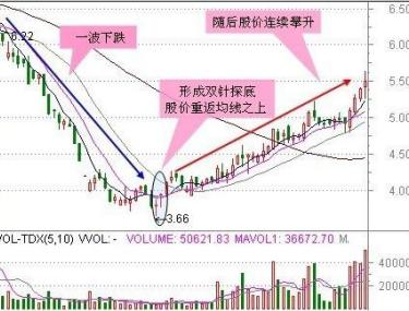 4 、“双针探底”。 股价在前期放量上涨后,缩量回调,在大均线附近出现两次下影K线组合,谓之双针探底,一旦股价重返短期均线上方,往往将转入急攻行情,所以在第二次出现下影十字星线的大均线附近是较佳低吸点。