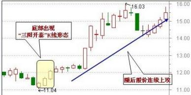 7 、“三阳开泰”。 股价在低档经过较长时间的整理之后,连续走出三根小阳线,形成“红三兵”走势,这是一波行情启动的信号。此K线组合的三根小阳线的收盘价逐日向上移动,且多半属于当天的较高价格为,武士勇往直前的形象跃然纸上,底部趋升的形式甚为明显,故称“三阳开泰”。