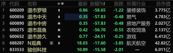 目前来看,已经被冠名“退市”的个股正在被投资者疯狂抛售,截至发稿,退市昌鱼、退市中房、退市中天、退市罗顿暴跌逾60%。