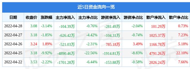 资金流向数据方面,4月28日主力资金净流出104.39万元,游资资金净流出281.49万元,散户资金净流入101.29万元。