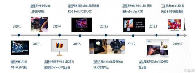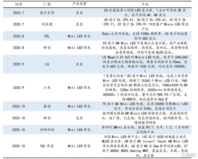 Mini/Micro LED背光和直显市场被业内视作未来迈入超高清时代的最佳显示技术路线,近几年来以来一致预期不断升温。自2019年以来,TCL、小米、华硕等消费电子品牌陆续发布旗下Mini LED背光产品,涵盖电视、显示器、笔电等多个领域。其中,具有风向标作用的苹果、三星等公司旗下Mini LED产品均预计将于2021年发布。