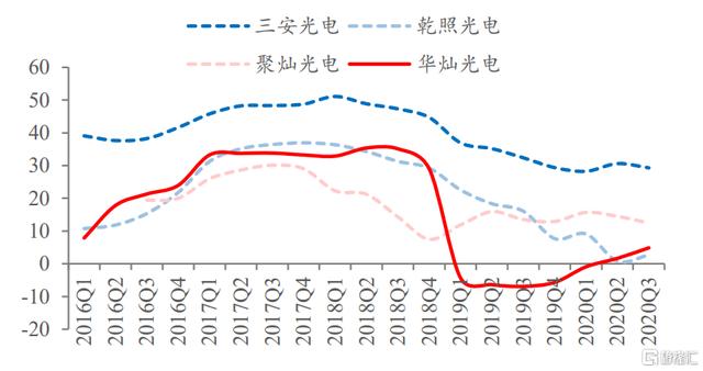 2019年营收top5 LED芯片厂商2016年至今的毛利率(%)